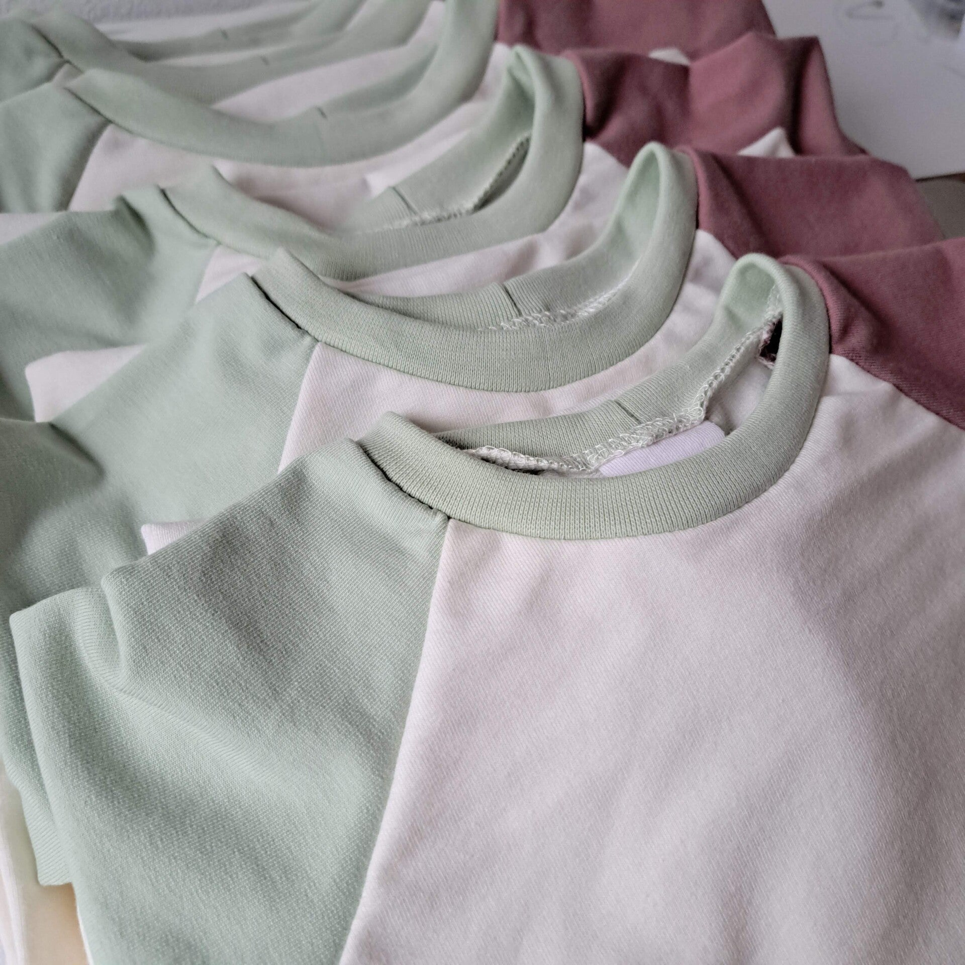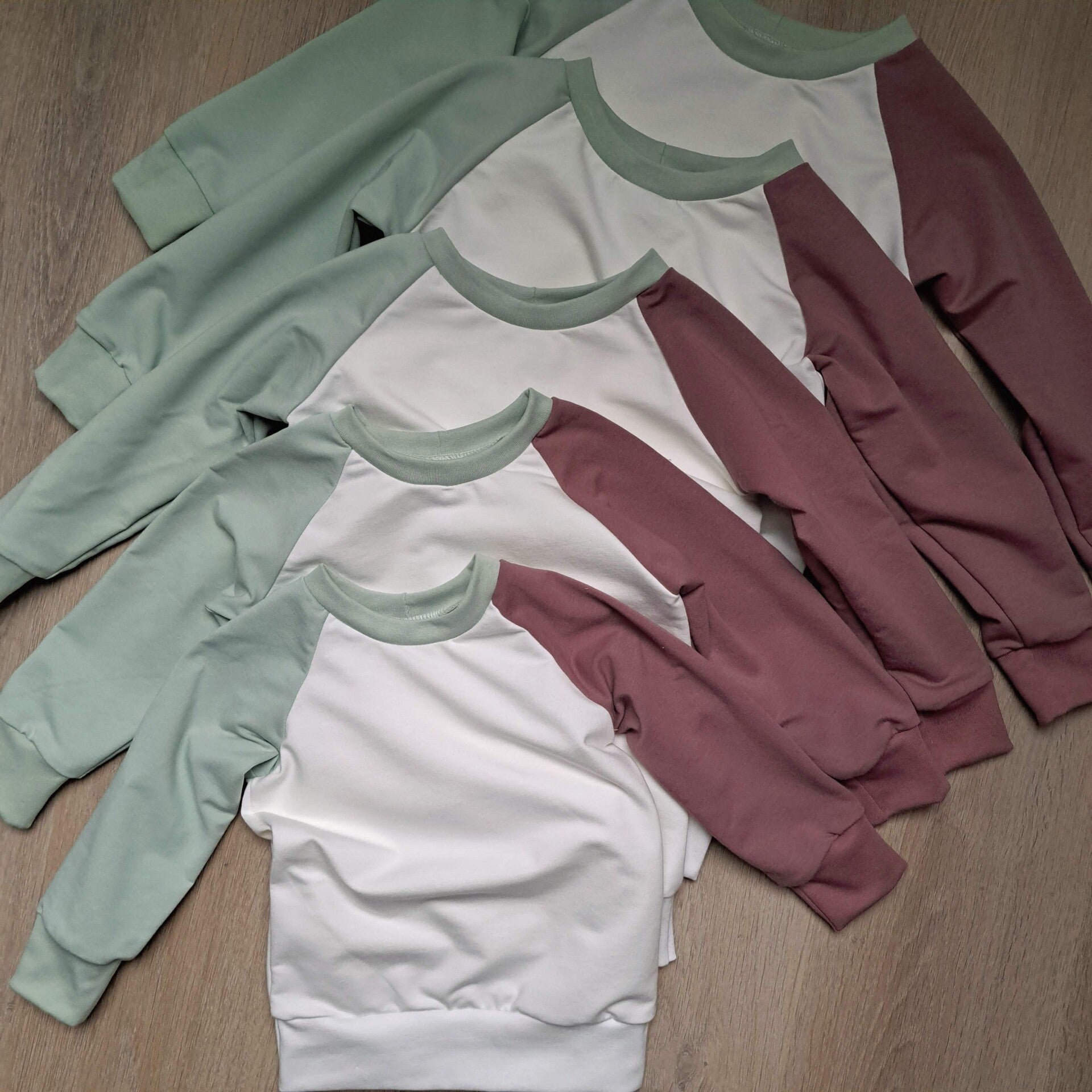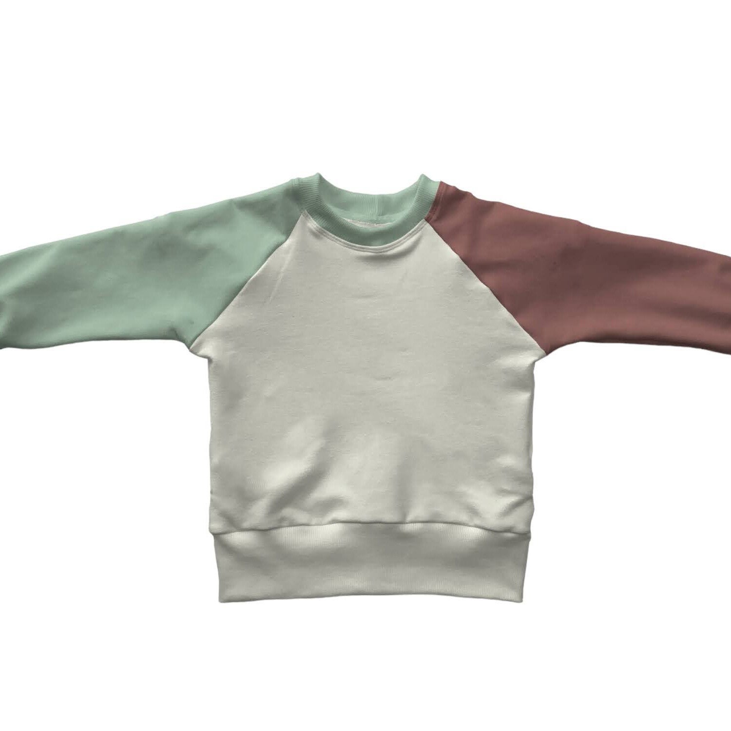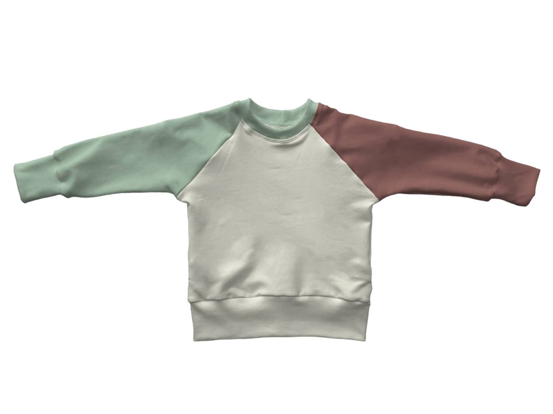 Handgemaakte sweater met raglan mouwenMateriaal: 95% biologisch katoen 5% lycraKleur: offwhite met mouwen in lichtgroen en oudpaarsDeze sweater is unisex en dus leuk voor zowel jongens als meisjes. Super tof om te combineren op een baggy jeans!