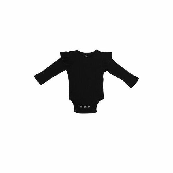 Deze zwarte ruffle romper is toch té leuk? De romper is gemaakt van prachtige jersey ribstof en heeft ruches op de schouders. De romper sluit met drukknoopjes dus is ook ideaal met verschonen/omkleden.